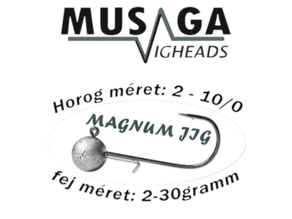 Musaga - Magnum Jig horog fejjelA pergető horgászat egyik alapja a gumihalas illetve a twisteres módszer, melyhez a MUSAGA gyártó cég a kiváló minőségű SASAME horgokat felhasználva készíti el JIG fejes horogjait.Egyik típusa a Magnum, melynek az ólom fej kialakítása a megszokott gömb alakú, viszont a műcsalink lecsúszását egy arra kialakított a horoggal párhuzamos kampós végű merev drót akadályozza meg.Kapható horog méretek: 4 - 10/0Az elérhető fejméreteket a választéklistából lehet kiválasztani.